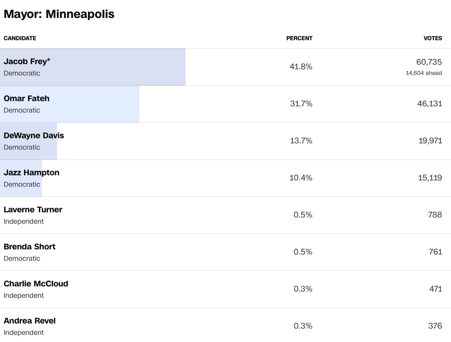Minneapolis Mayor Jacob Frey is facing several challengers, led by democratic socialist state Sen. Omar Fateh. While Frey is backed by Minnesota Gov. Tim Walz and Sen. Amy Klobuchar, Minneapolis progressive Rep. Ilhan Omar has endorsed Fateh. The race uses ranked-choice voting, and three of Frey’s top challengers – Fateh, businessman Jazz Hampton and Rev. DeWayne Davis – have urged their supporters to rank each other to block Frey’s reelection. Round 2 coming up.