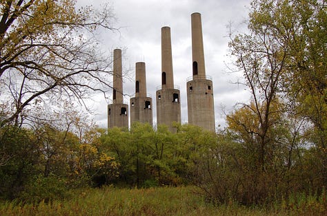 For decades, there were three sets of five smokestacks visible from US highway 52. They began to disappear about twenty years ago, and they are now all gone.