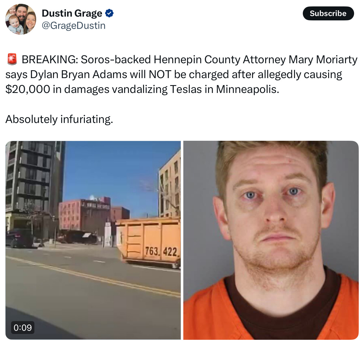 Dylan Adams, the state employee who committed multiple felonies by damaging multiple Tesla’s and was caught redhanded on camera won’t be criminally charged.