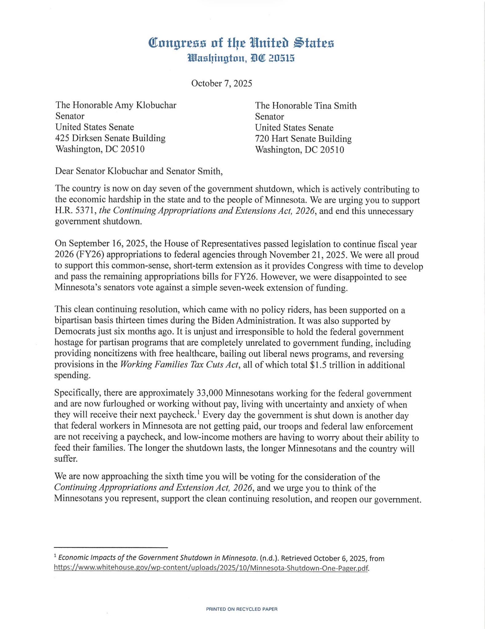 All four Republicans representing Minnesota in Congress have called on Minnesota DFL Senators Amy Klobuchar and Tina Smith to vote in favor of a GOP resolution that reopens the federal government.
