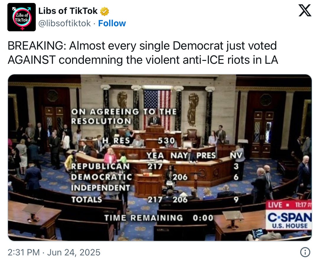 House Resolution 516, Condemning the violent and unlawful riots in Los Angeles. That’s it in a nutshell and Morrison couldn’t bring herself to vote for that. Wow. That’s really special. You know what’s even more special than that? No Democrat voted for it. Not one.