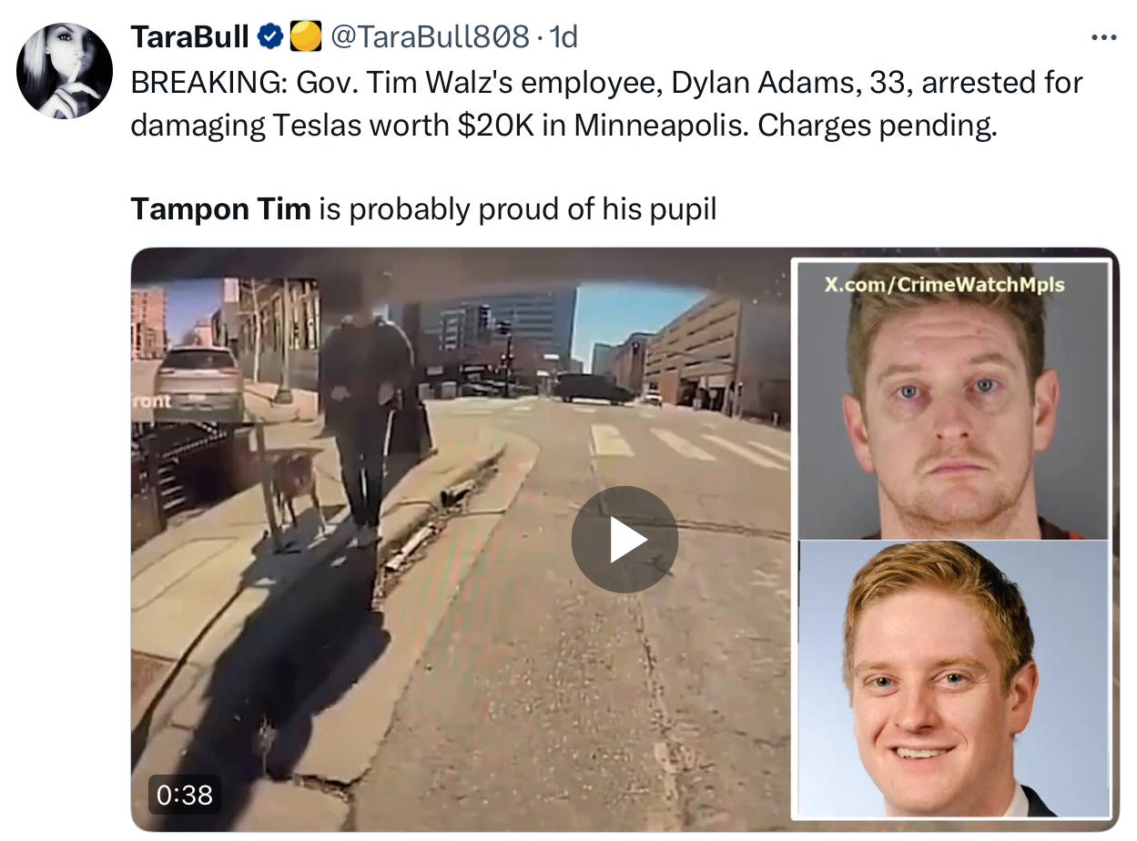 Minnesota Governor Tim Walz’s hateful and violent promoting rhetoric more than likely contributed to Dylan Adams, who works for Minnesota’s Department of Human Services decision to cause 20k plus in damages to Tesla vehicles owned privately, by complete strangers, utilizing a known Democrat tactic of emulating Nazi Germany’s brownshirts.