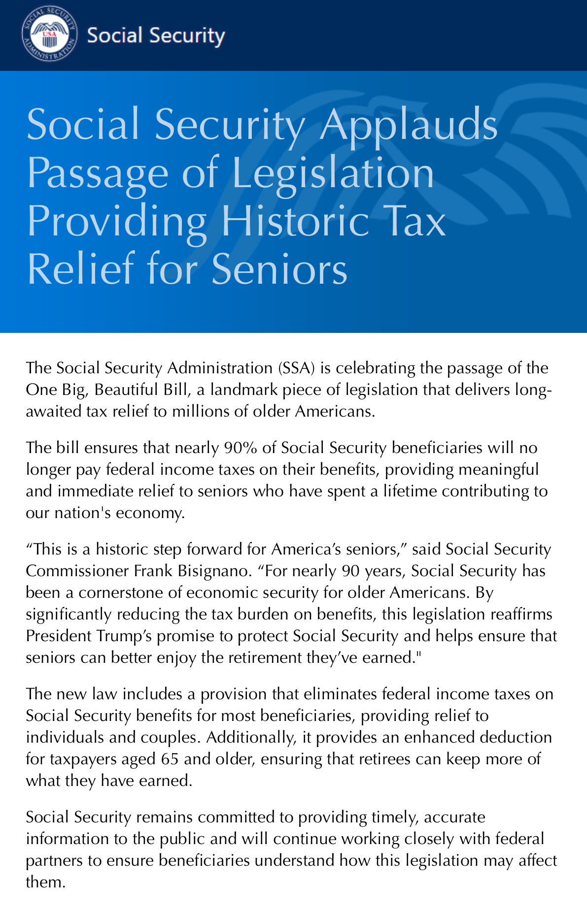 You can read the SSA statement entitled, Social Security Applauds Passage of Legislation Providing Historic Tax Relief for Seniors, or read the same, attached statement.
